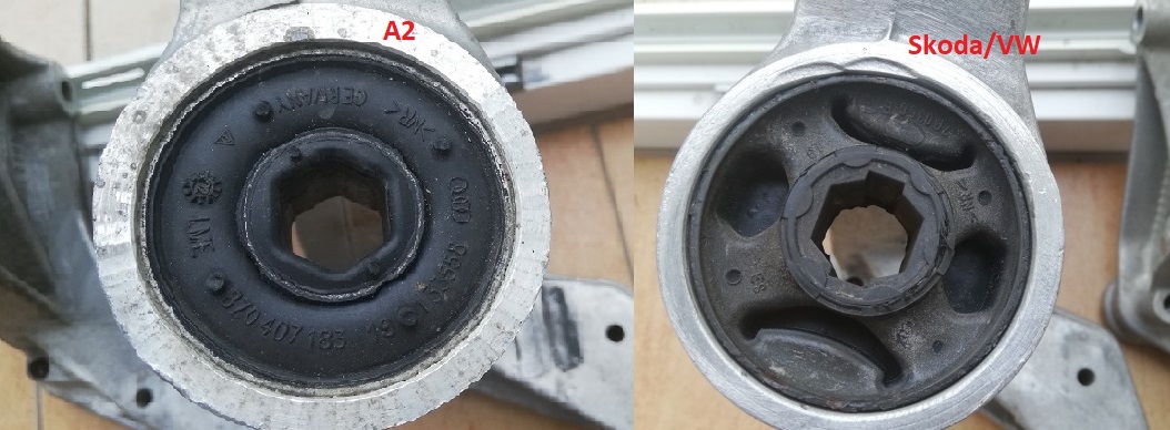 1. Należy uwzględnić aby tuleje po obu stronach miały taką samą twardość. W A2 tuleje są twardsze niż w Skodzie. Skoda ma profilowaną  gumę aby bardziej była podatna na uginanie. A2 ma pełną gumę w całym obwodzie więc jest twardsza.